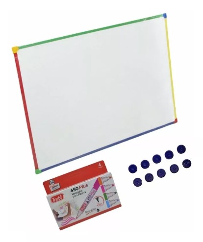 la pizarra contiene fibron+borrador incluido, es de madera y no es imantada.