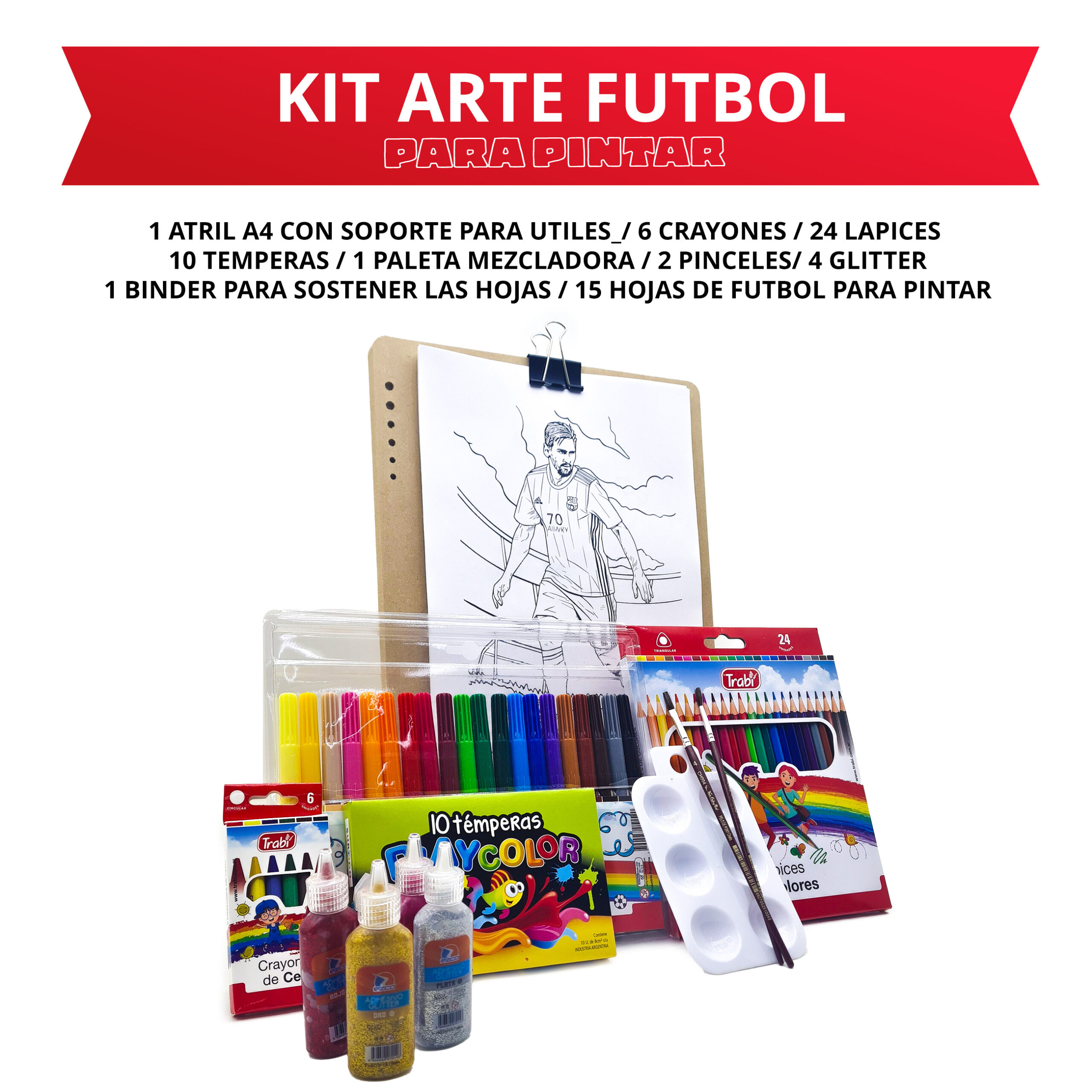 1 atril A4 con soporte para utiles_/ 6 crayones / 24 lapices/ 10 temperas Play Color o Model / 1 paleta mezcladora / 2 pinceles/ 4 Glitter 1 binder para sostener las hojas / 15 hojas de Futbol para pintar.
