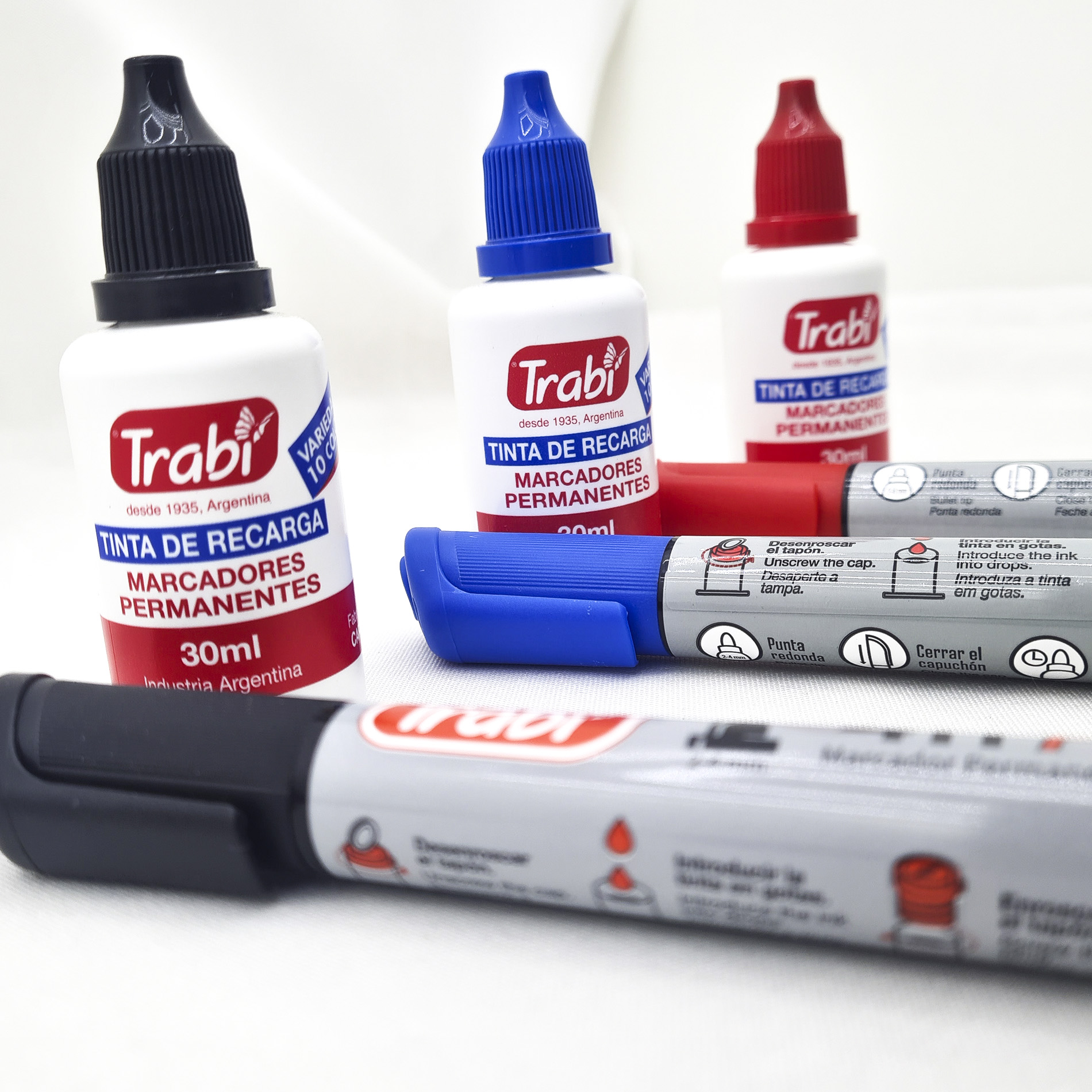 Kit de 3 marcadores permanentes 411 en colores negro, rojo y azul, con punta redonda, incluye 3 tintas de 30 ml para recargar. Ideal para un uso prolongado y práctico en diversas superficies.