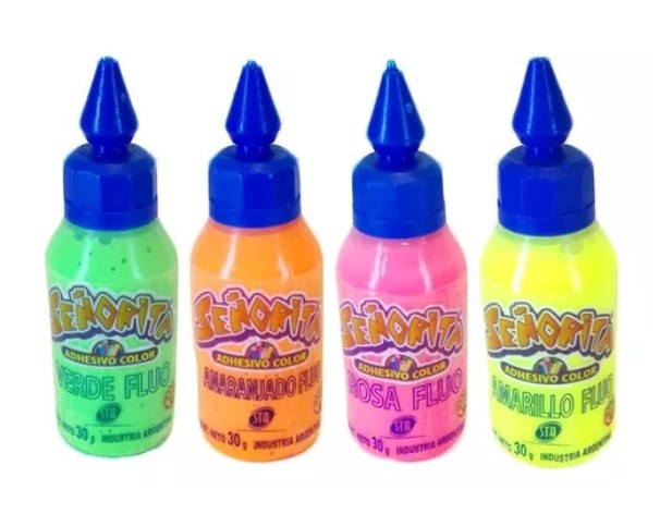 La Plasticola Colores de 40 gramos viene en una variedad de colores, como celeste y amarillo, ideal para manualidades y proyectos decorativos.
