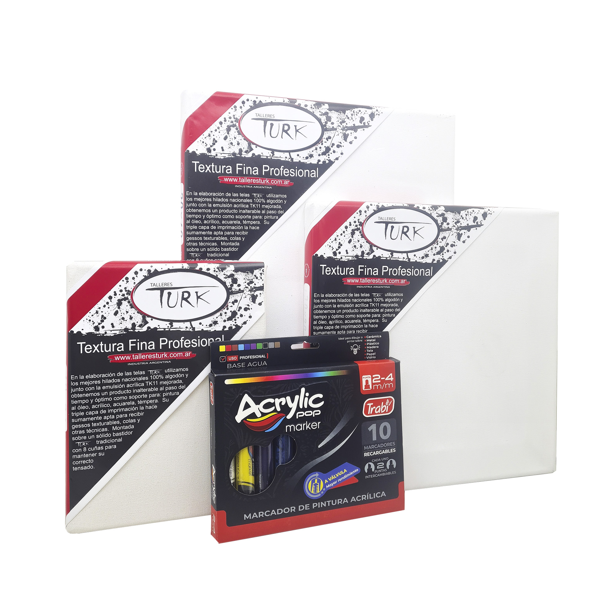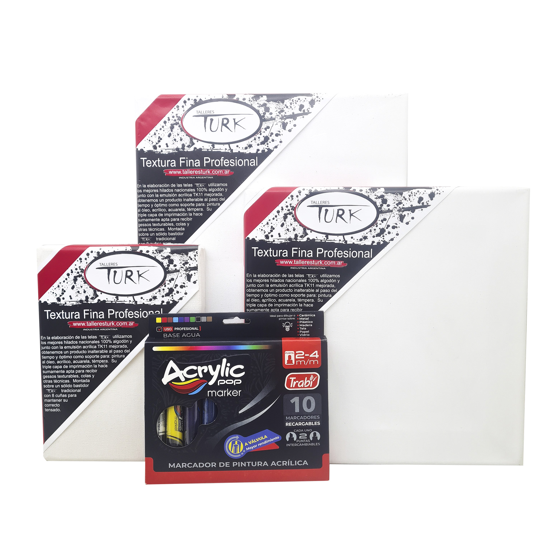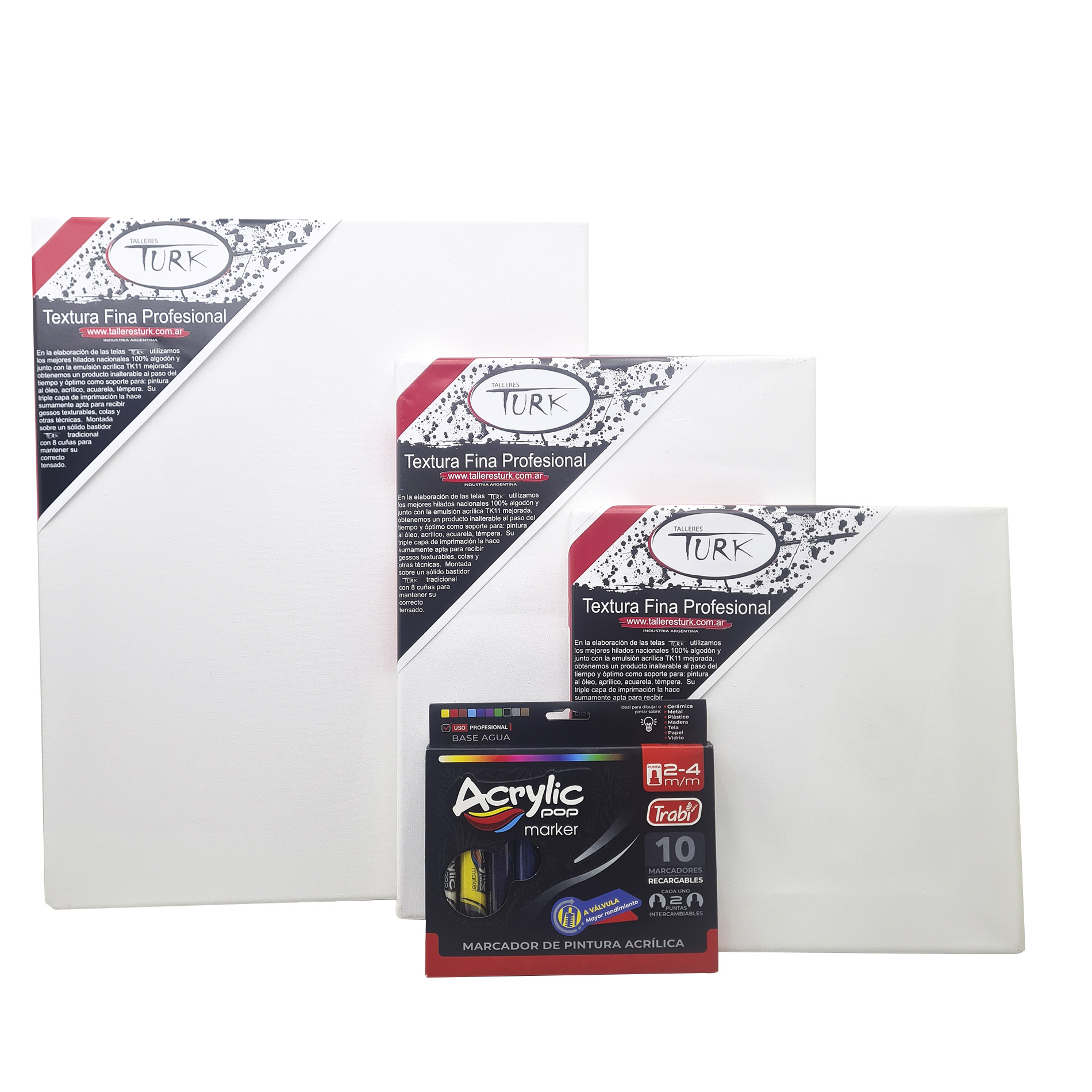Set Kit Arte Trio Marcadores Acrílicos + Bastidores de Lienzo» incluye 10 marcadores acrílicos de doble punta, recargables y en una amplia gama de colores. Perfectos para crear en tres bastidores de lienzo de algodón argentino de alta calidad, disponibles en tamaños: 18×24 cm, 30×30 cm y 30×40 cm. ¡Ideal para artistas y creativos que buscan versatilidad y calidad!