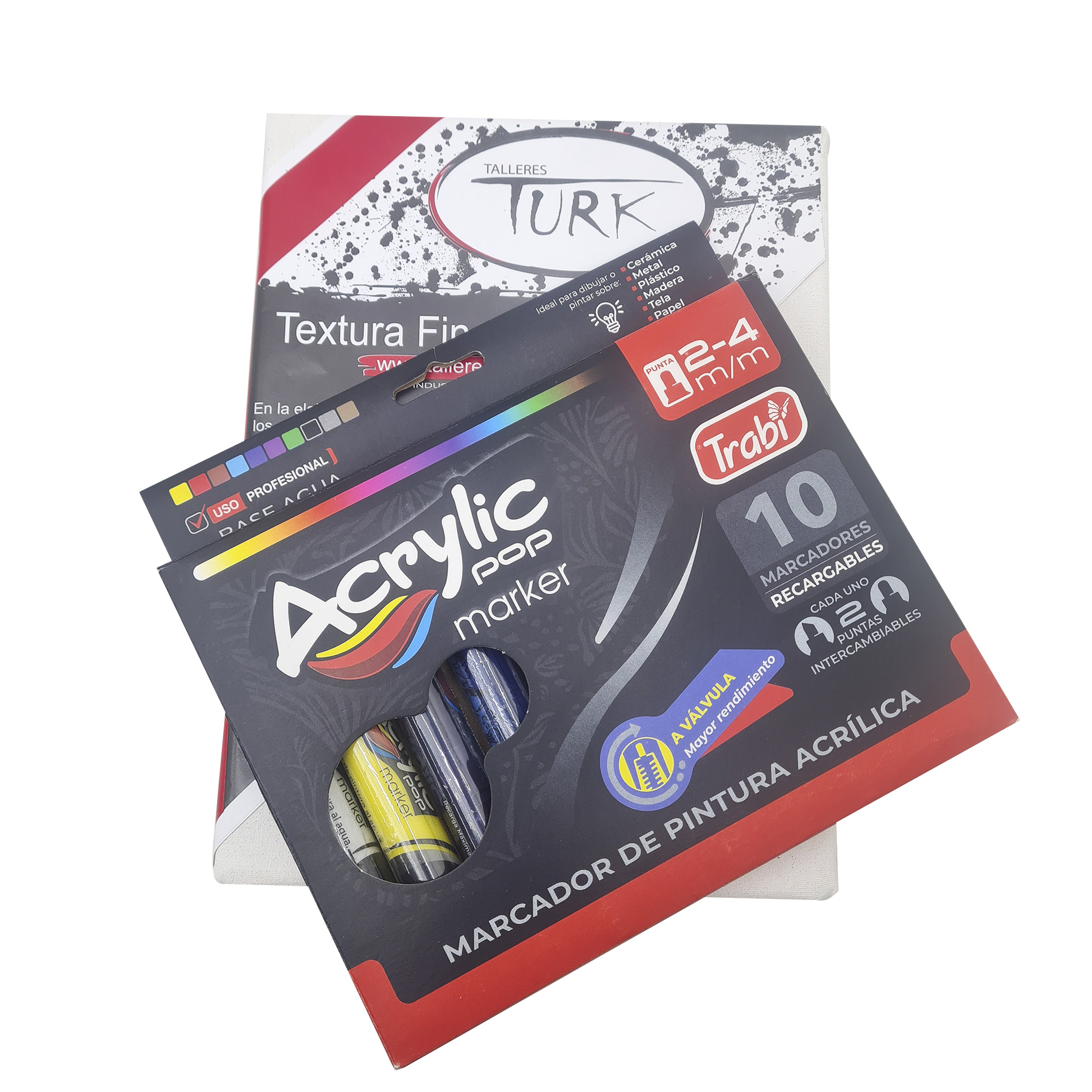 Kit de arte simple con fibrones acrílicos de doble punta y bastidor de 18×24 cm. Perfecto para crear pinturas con colores intensos y líneas precisas en un lienzo de alta calidad.